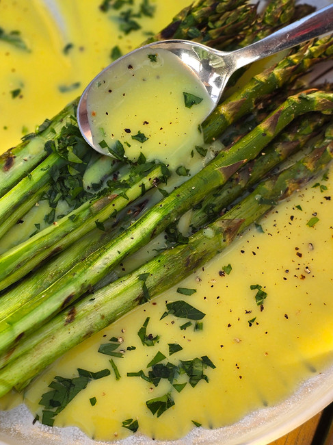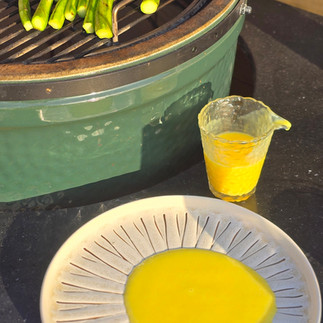 Mijn eerste asperges van het jaar, met een friszure citroen-saffraansaus.