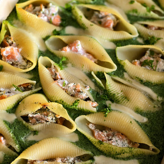 Gevulde schelpen met ricotta en zalm, echt een smaakbom. Deze ovenschotel kan op voorhand voorbereid worden en vlak voor het serveren in de oven warm gemaakt worden.