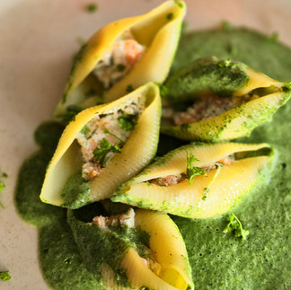 Conchiglie met zalm en saus van spinazie en groene kruiden