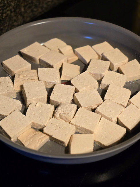 Bak de tofu langs beide kanten goudbruin, ongeveer 5 minuten langs elke kant.