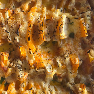 Snij de knolselder en butternut in schijfjes van allemaal gelijke grootte, bvb: ongeveer 0,5 cm dik, 3 cm breed, 3 cm lang.