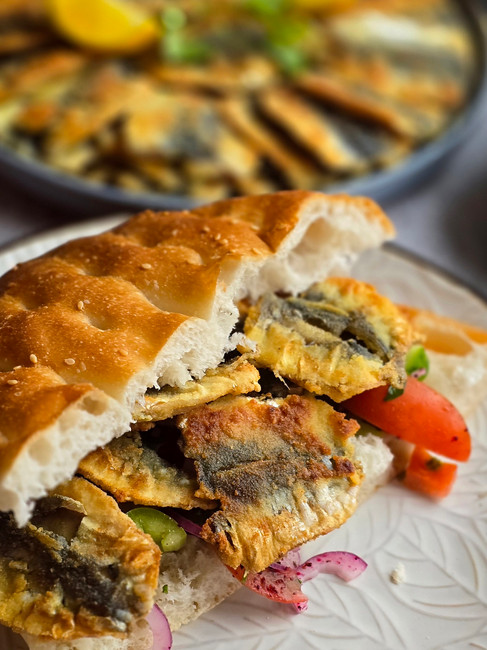 Ansjovis, krokant gebakken met een lekker korstje. Daarbij enkele heerlijke Turkse salades en brood. Een van mijn favorieten.