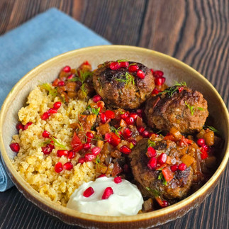 Lamsgehaktballen met verse kruiden, groentensaus met granaatappel