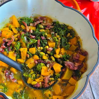 Een stoofpotje dat perfect past bij de herfst: butternut, bonen, boerenkool en hartig spek vormen samen een verwarmend gerecht vol smaak. Ideaal voor koude dagen. Dit gerecht valt voor mij tussen een soep en een stoofpotje. Je kan altijd meer/minder vocht toevoegen naar wens.