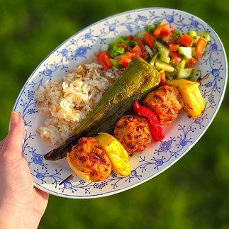 Serveer met gegrilde paprika, Turkse herderssalade en rijst