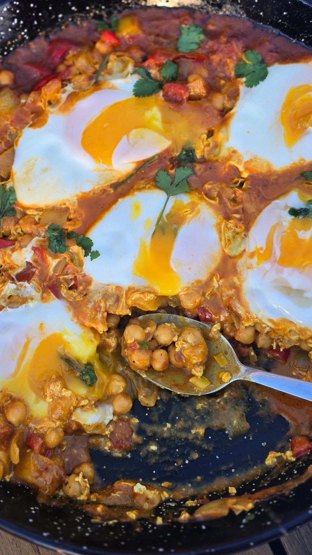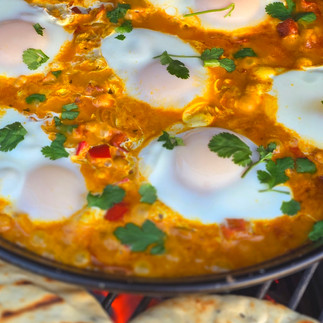 Een kruising tussen twee gerechten. Geinspireerd door Indiase en Midden-Oosterse smaken. Eieren werden gepocheerd in een rijke tikka masala saus met kikkererwten. Geserveerd met papadum, naan en een Indiase salade. Een heerlijk vegetarisch gerecht.