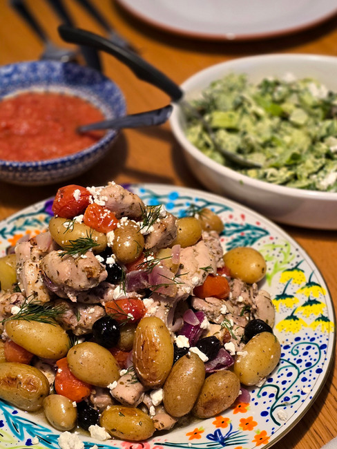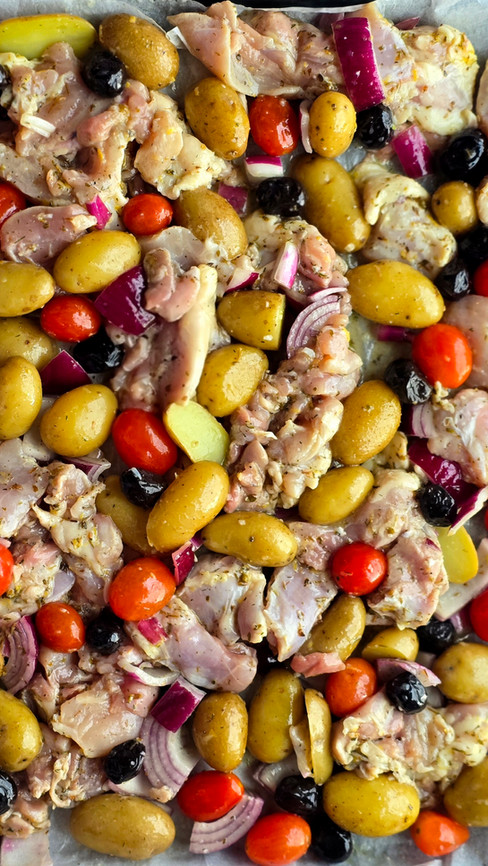 Traybake met kip, krieltjes en Griekse marinade